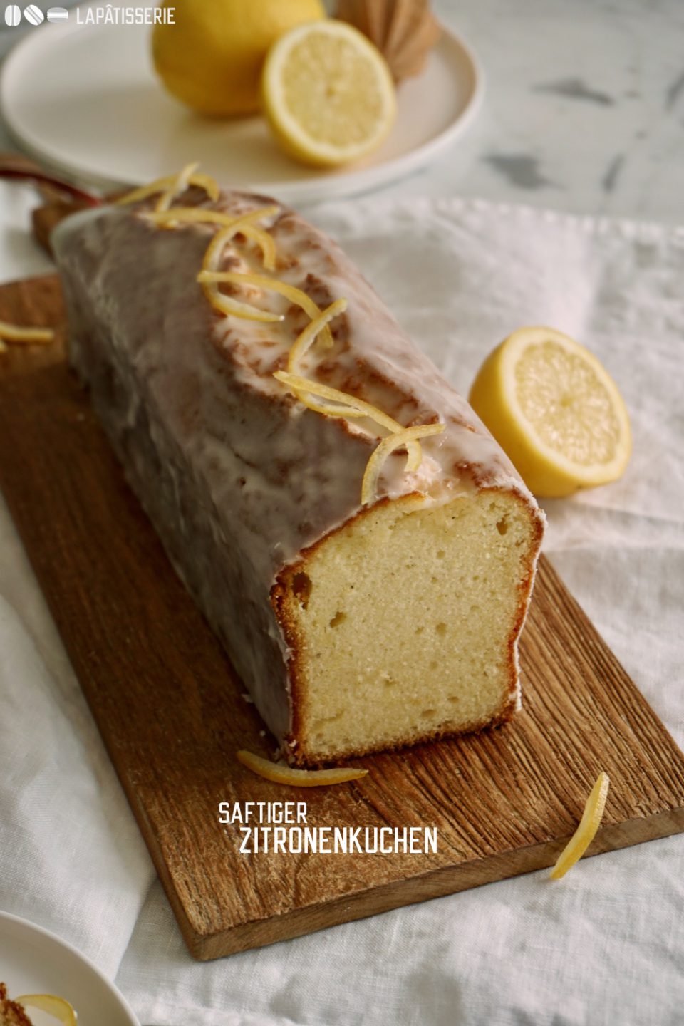 - 20 g Zitronensaft | 100 g PuderzuckerDen Puderzucker sieben und in eine Schüssel geben. Den restlichen Zitronensaft bzw. 20g zu dem gesiebten Puderzucker geben und verrühren bis eine glatte Glasur entstanden ist.Den abgekühlten Zitronenkuchen mit der Glasur bepinseln. Die Glasur aushärten lassen und den Kuchen am nächsten Tag anschneiden, damit sich das volle Zitrusaroma entwickeln kann.