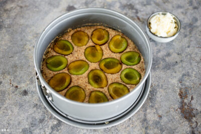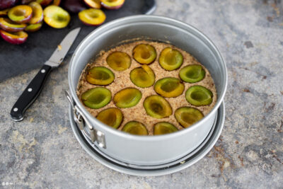 - 250 g ZwetschgenZwetschgen waschen, entsteinen und halbieren.Halbierte Zwetschgen rundherum auflegen und leicht in die Mandelcreme drücken.