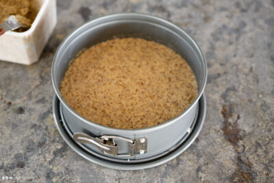 - Ofen auf 160°C (Umluft) vorheizen.Mürbeteig in der Größe des Tortenrings (18cm Durchmesser) ausstechen und in den Tortenring einlegen.